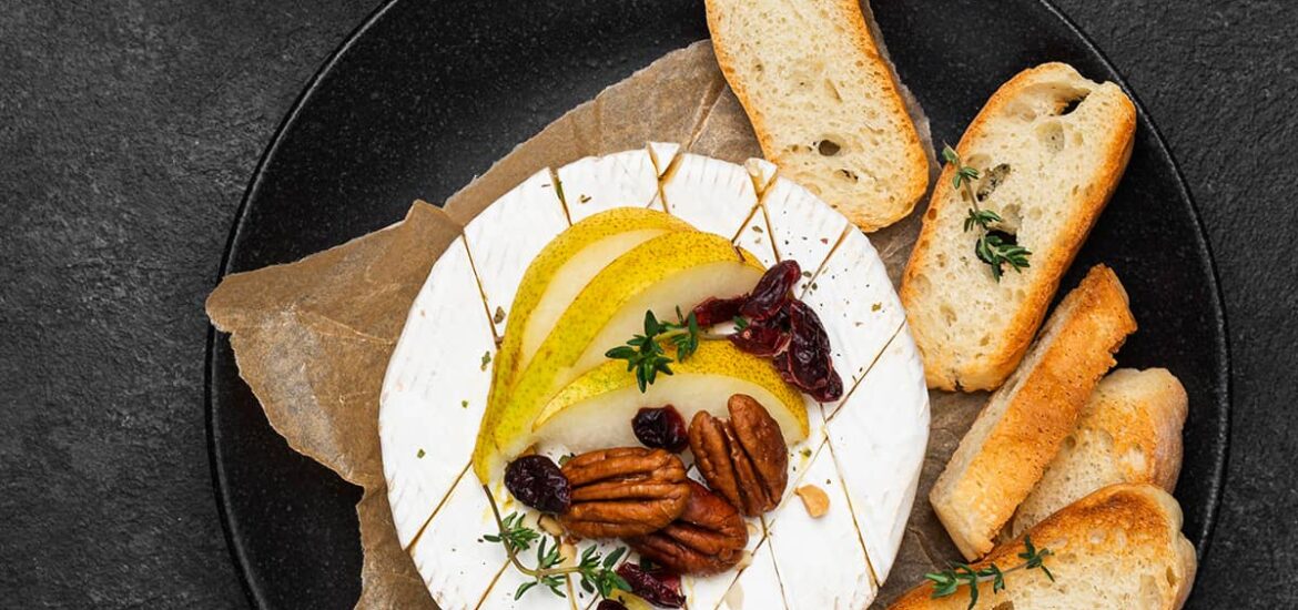 Baked brie topped with sliced pears, toasted pecans, dried cranberries, and a drizzle of honey, garnished with fresh thyme.
